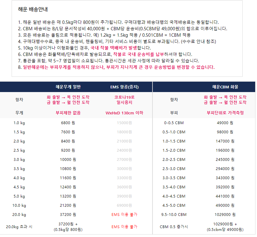 더베이 중국 배송요금은 운송비 + 국내 배송비가 포함되어 있습니다. * 더베이 배송요금 적용기준안내 1.더베이 중국 배송요금은 해운운송비+국내배송비가 모두 포함되어 있습니다. (CJ 택배 1박